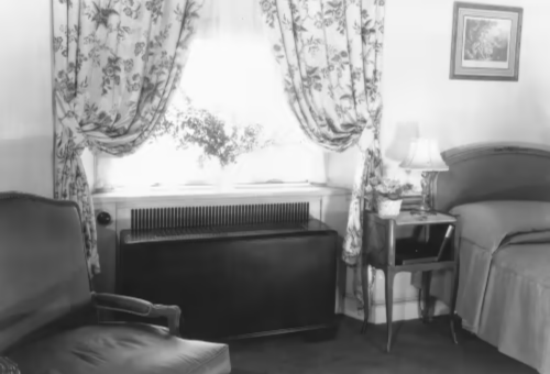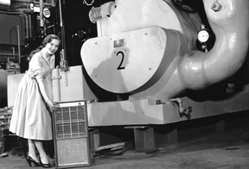 Малко снимки демонстрират широчината на възможностите на Carrier по-добре от този кадър от 1957 г. от изложението за мобилни домове в Колизеума в Ню Йорк (на мястото на днешния Time Warner Center). Домакинята завърта контролния диск на малък климатик Roomette с мощност една конска сила за мобилни домове, докато зад нея центробежен охладител Carrier осигурява охлаждане на деветте акра изложбено пространство на изложението.
