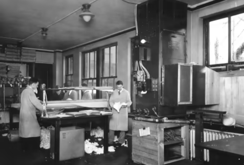 Текстилната промишленост е била сред най-ранните и най-ентусиазирани възприели модерната климатизация. Тук купувачите на New England Cotton работят в чиста и ефективна среда.