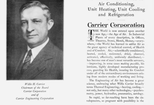 Когато организаторите на Ню Йорк създават комитет на Световния панаир през 1935 г., те възприемат мотото „Изграждане на света на утрешния ден“ и се заемат с привличането на компании и технологии, които осигуряват „индивидуална реализация и човешки прогрес“. Малцина отговарят на това определение по-добре от Carrier Corporation и модерните климатици.