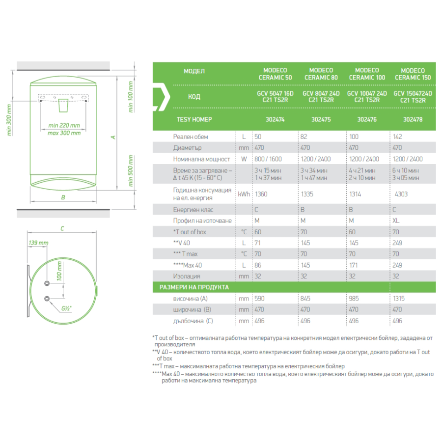 Електрически бойлер TESY ModEco Ceramic 82л. 2400W, вертикален
