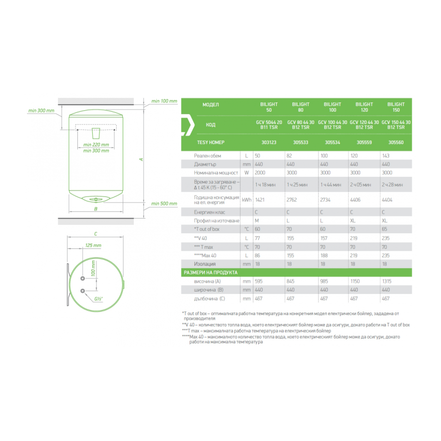 Електрически бойлер TESY BiLight 120л. 3000W, вертикален