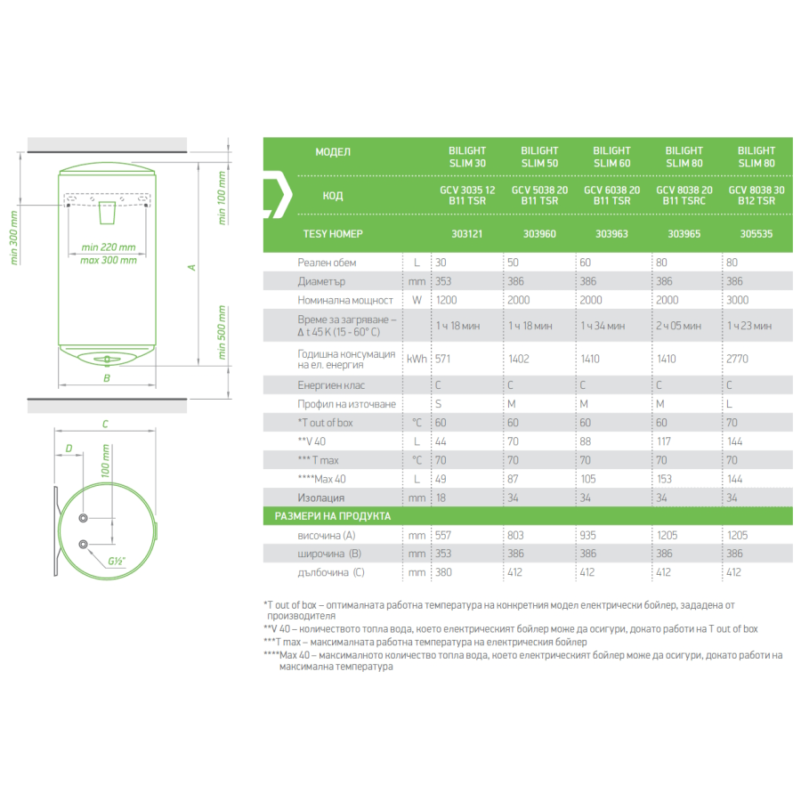 Електрически бойлер TESY BiLight Slim 80л. 2000W, вертикален