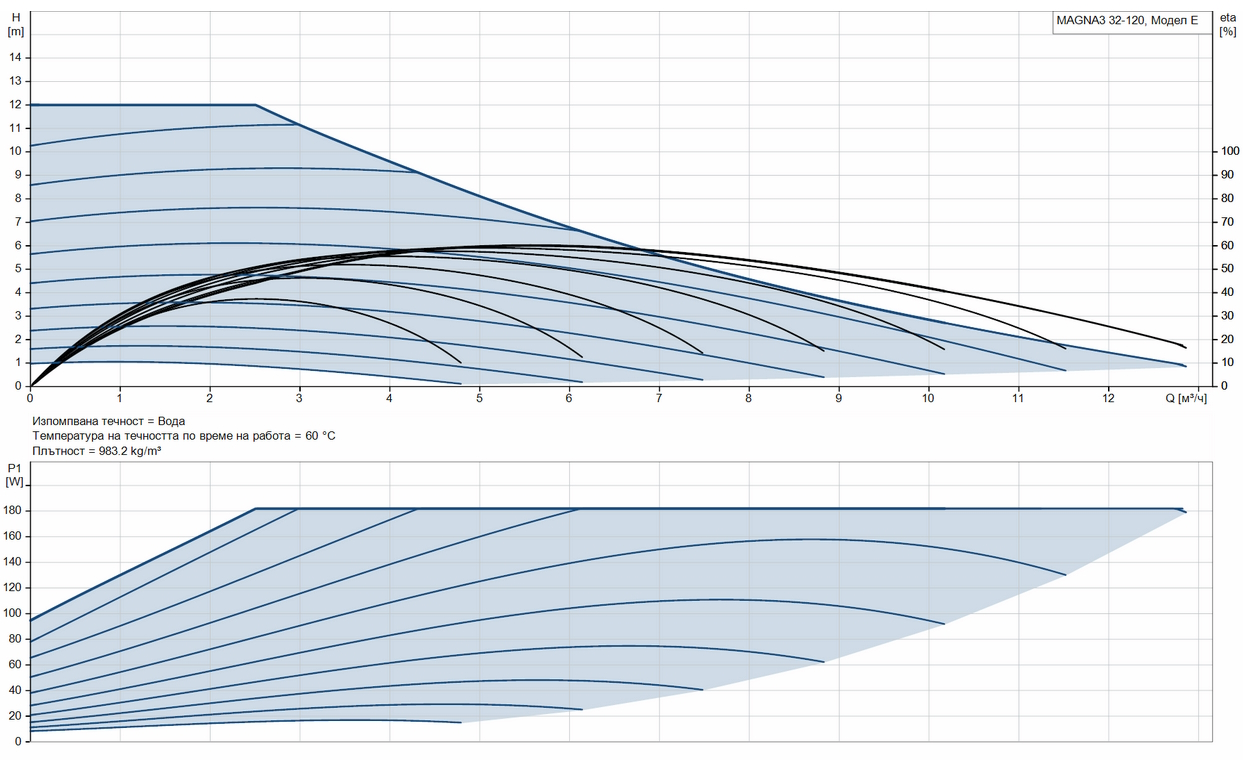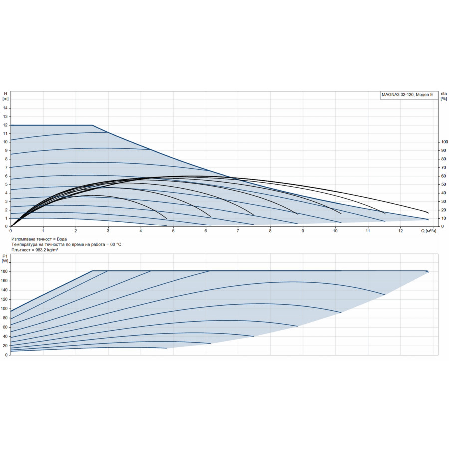 • Характеристики: GRUNDFOS MAGNA3 обединява електронно комутиращ двигател с ротор с постоянни магнити, помпен контролер, вграден в клемната кутия, керамични радиални лагери и въглеродни аксиални лагери, роторна кутия, лагерни плочки и роторно покритие от неръждаема стомана, статорен кожух от алуминиева сплав; корпус на помпата от чугун; защита от претоварване.