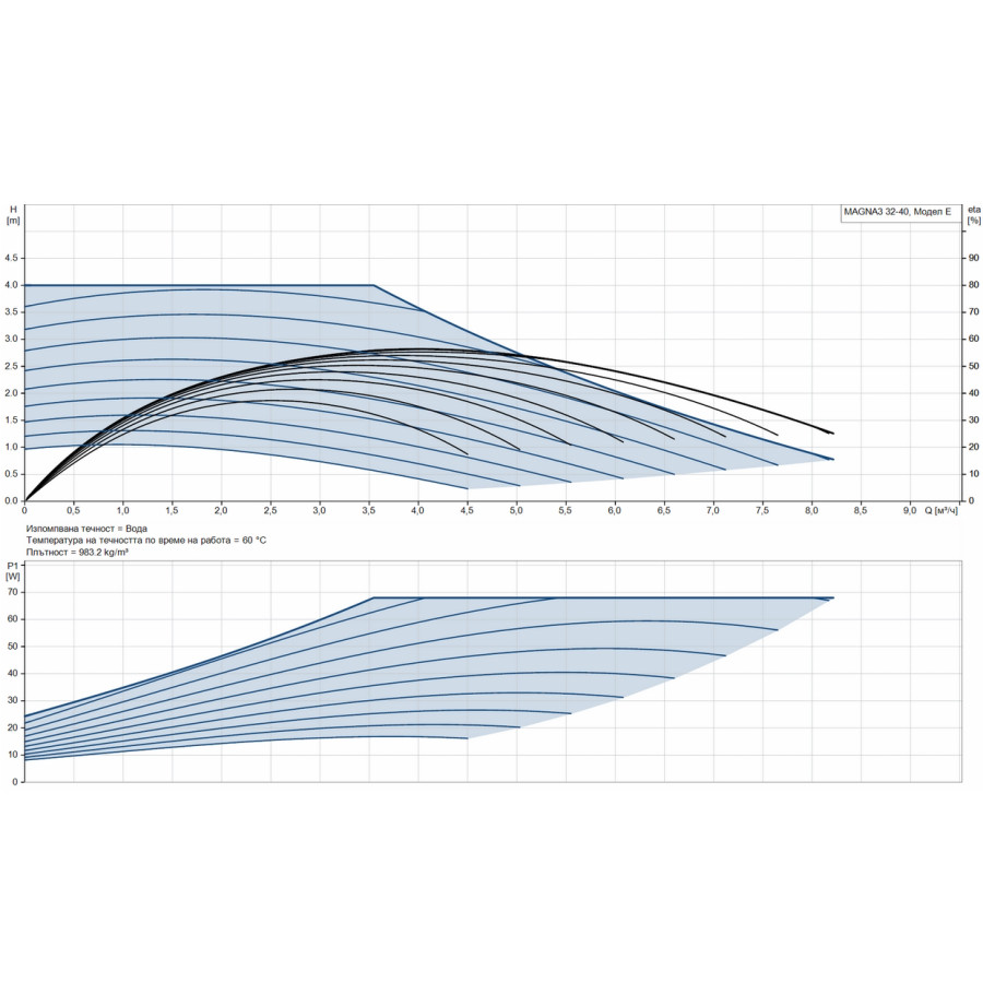 • Характеристики: GRUNDFOS MAGNA3 обединява електронно комутиращ двигател с ротор с постоянни магнити, помпен контролер, вграден в клемната кутия, керамични радиални лагери и въглеродни аксиални лагери, роторна кутия, лагерни плочки и роторно покритие от неръждаема стомана, статорен кожух от алуминиева сплав; корпус на помпата от чугун; защита от претоварване.