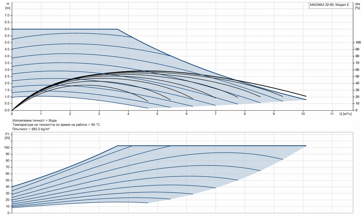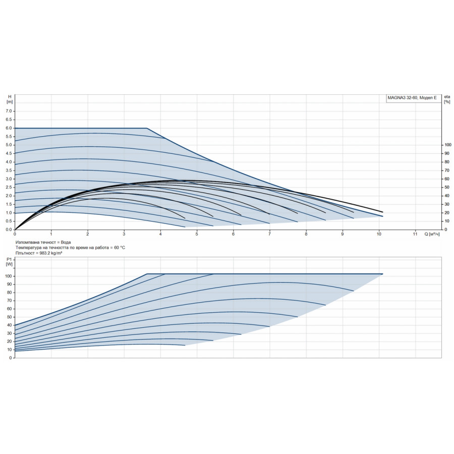 • Характеристики: GRUNDFOS MAGNA3 обединява електронно комутиращ двигател с ротор с постоянни магнити, помпен контролер, вграден в клемната кутия, керамични радиални лагери и въглеродни аксиални лагери, роторна кутия, лагерни плочки и роторно покритие от неръждаема стомана, статорен кожух от алуминиева сплав; корпус на помпата от чугун; защита от претоварване.
