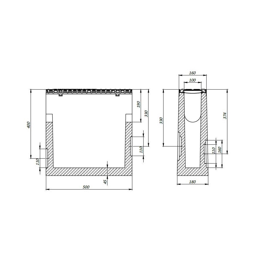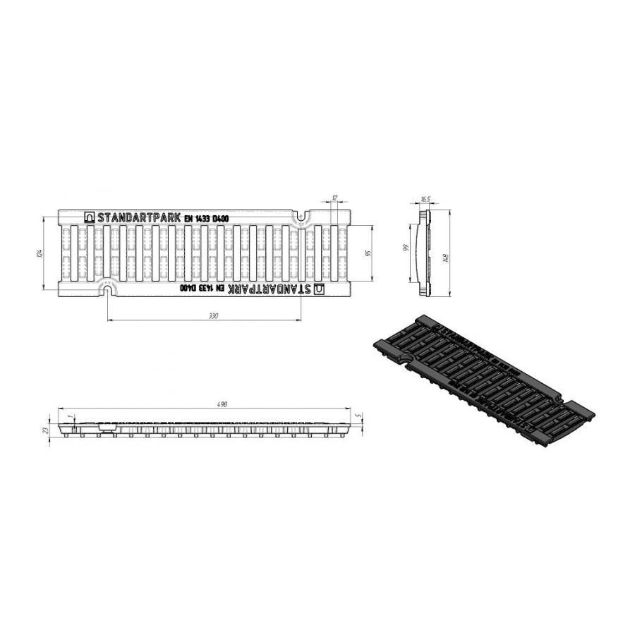 Линеен отводнител /пясъкоуловител/ DN100 с вътрешно сечение 100 mm, оборудван с решетка от сферографитен чугун клас D400 (издържа на натоварване до 40 тона). Монтира на места с висока интензивност на трафика (бензиностанции, автомивки, индустриални зони, транспортни терминали, магистрали и автомобилни предприятия) с връзка към дренажни тръбопроводи. Ръбовете му са подсилени с поцинкована стоманена, върху която лежи чугунена решетка, която е здраво закрепена към пясъкоуловителя с помощта на болтове. Корпусът на пясъкоуловителя е изработен от фибробетон. Решетката му е изработена от сферографитен чугун и издържа натоварване до 40 тона, клас D400 (400 kN) съгласно EN 1433.