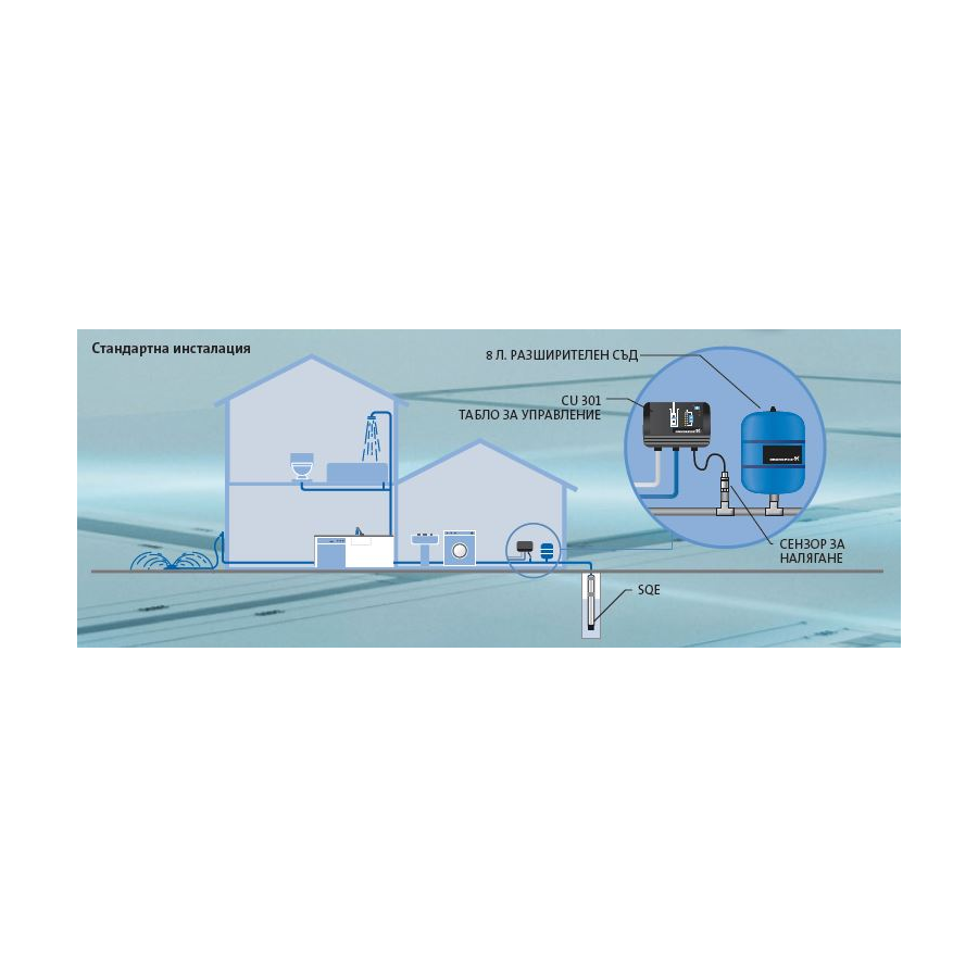 CU 301 осигурява пълен контрол на помпите от серията Grundfos SQE и позволява на системата да поддържа постоянно налягане в границите на максималната производителност на помпата, независимо от променливата консумация на вода. Налягането се установява от сензора за налягане и се предава към CU 301, който настройва работата на помпата в съответствие с него. (Сензорът за налягане се поръчва допълнително)